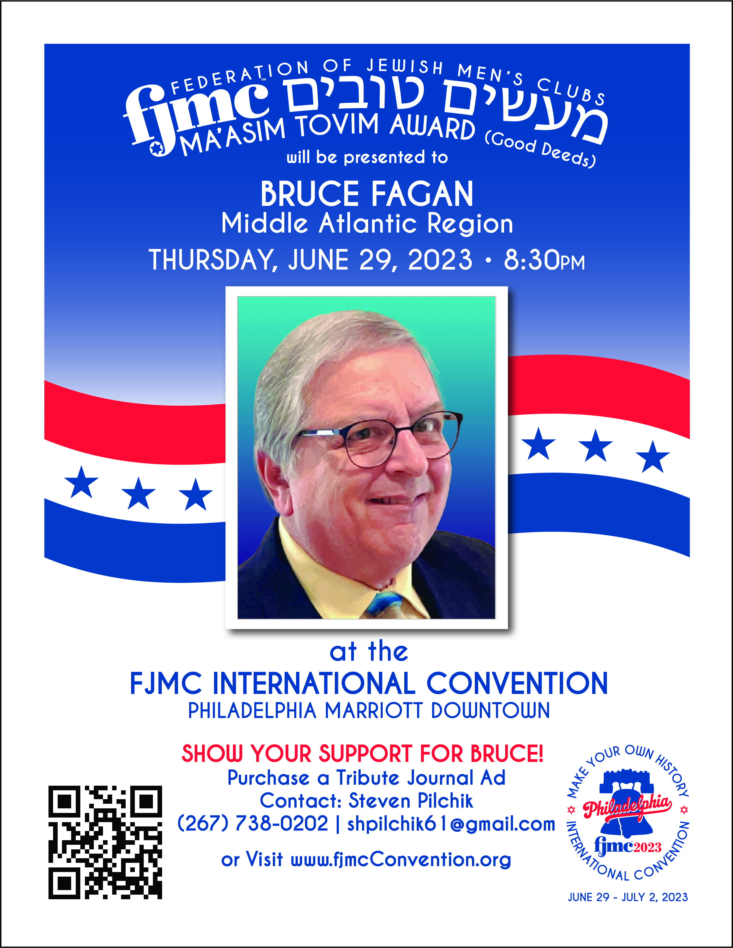 On the regional level, Bruce helped run the Tour de Shuls bike ride for Camp Ramah in the Poconos for several years and became the region’s webmaster. As president from 2015-2017, he visited and brought meetings to clubs around the region, ran the first “Drink Tank” think tank for club presidents and ran an Israel Advocacy Program with Women’s League. He is still webmaster plus does art and video production for Man of the Year.