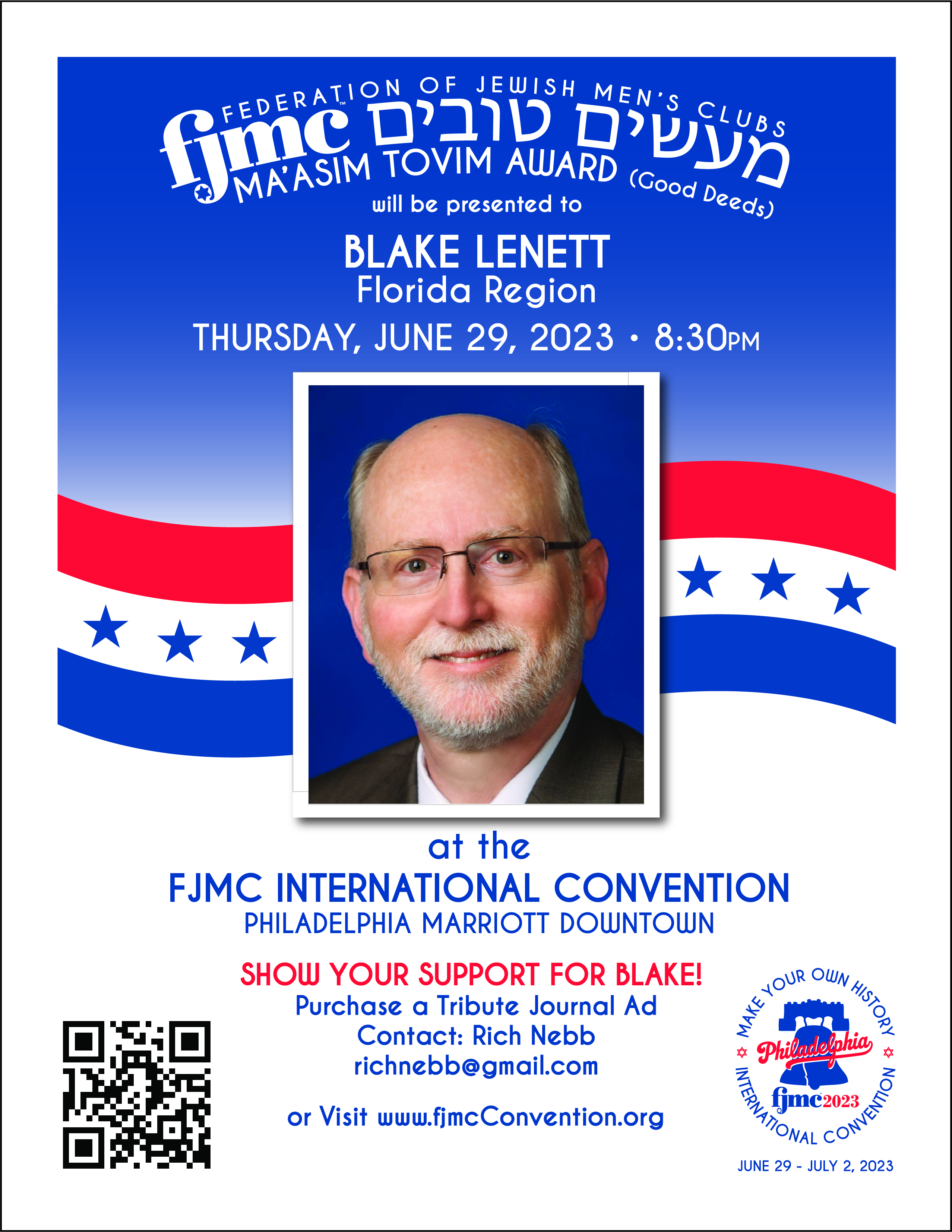 Blake Lenett is currently serving his 2nd term as Florida Regional President of the Federation of Jewish Men’s Clubs (FJMC) Florida Region.  Blake’s mentor was Ed Margolis, a Past Florida Region President.  Blake enjoys attending FJMC retreats and conventions, and interacting with like-minded people throughout the organization.  Blake’s passion for “Involving Jewish Men in Jewish Life” has helped ensure that the CBS Brotherhood is recognized year after year at the International level.  In 2022, Blake and Wendy were honored at the CBS Purim Gala in recognition for their contributions to their synagogue and the Jewish community.  Blake attributes his commitment to synagogue and Jewish life to his parents who have been his role models throughout his life.  “Religion, family and community are all critical, now more than ever.  We are looking forward to a wonderful future with family and friends!”